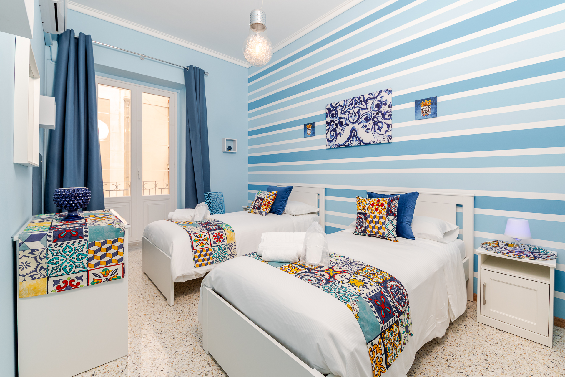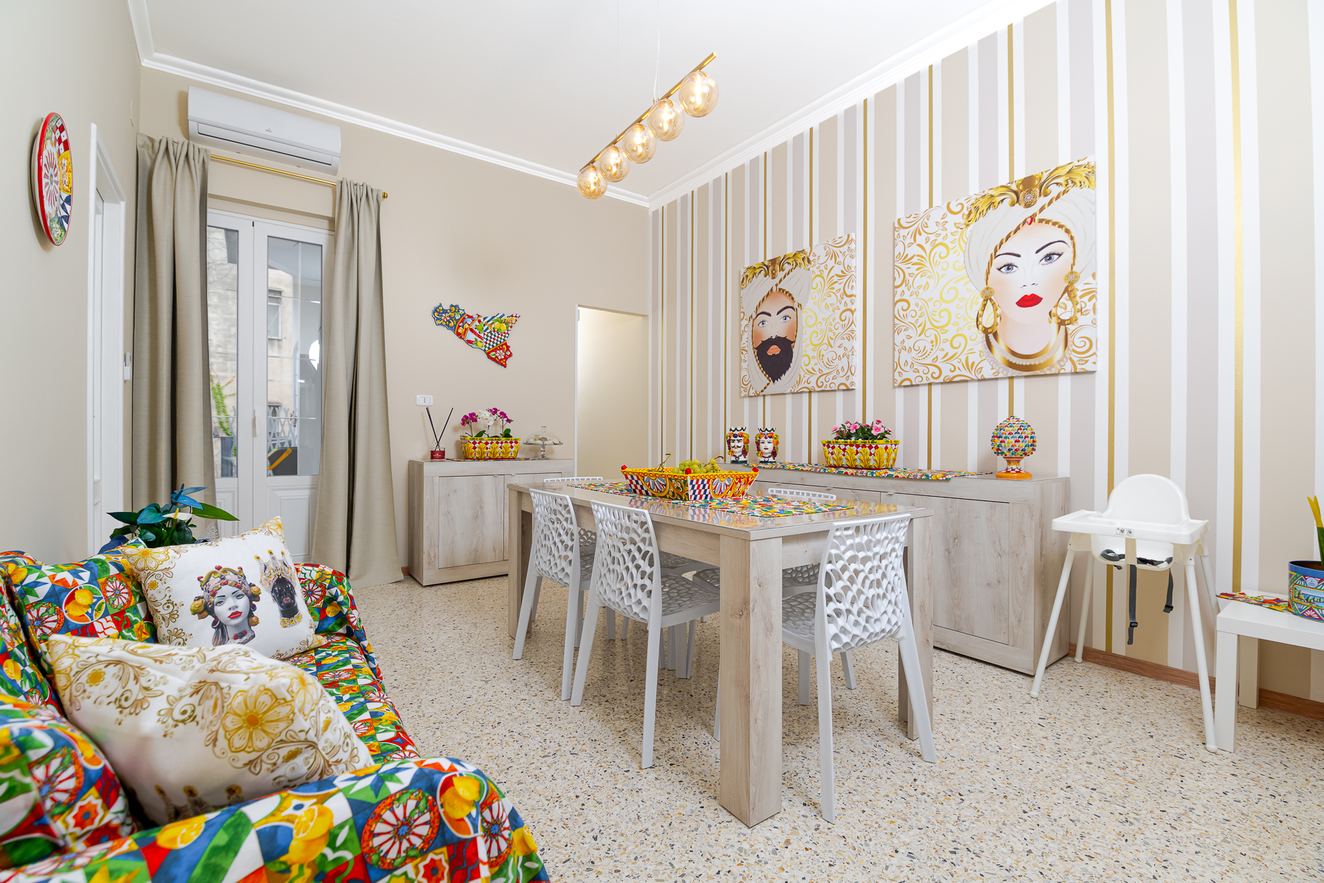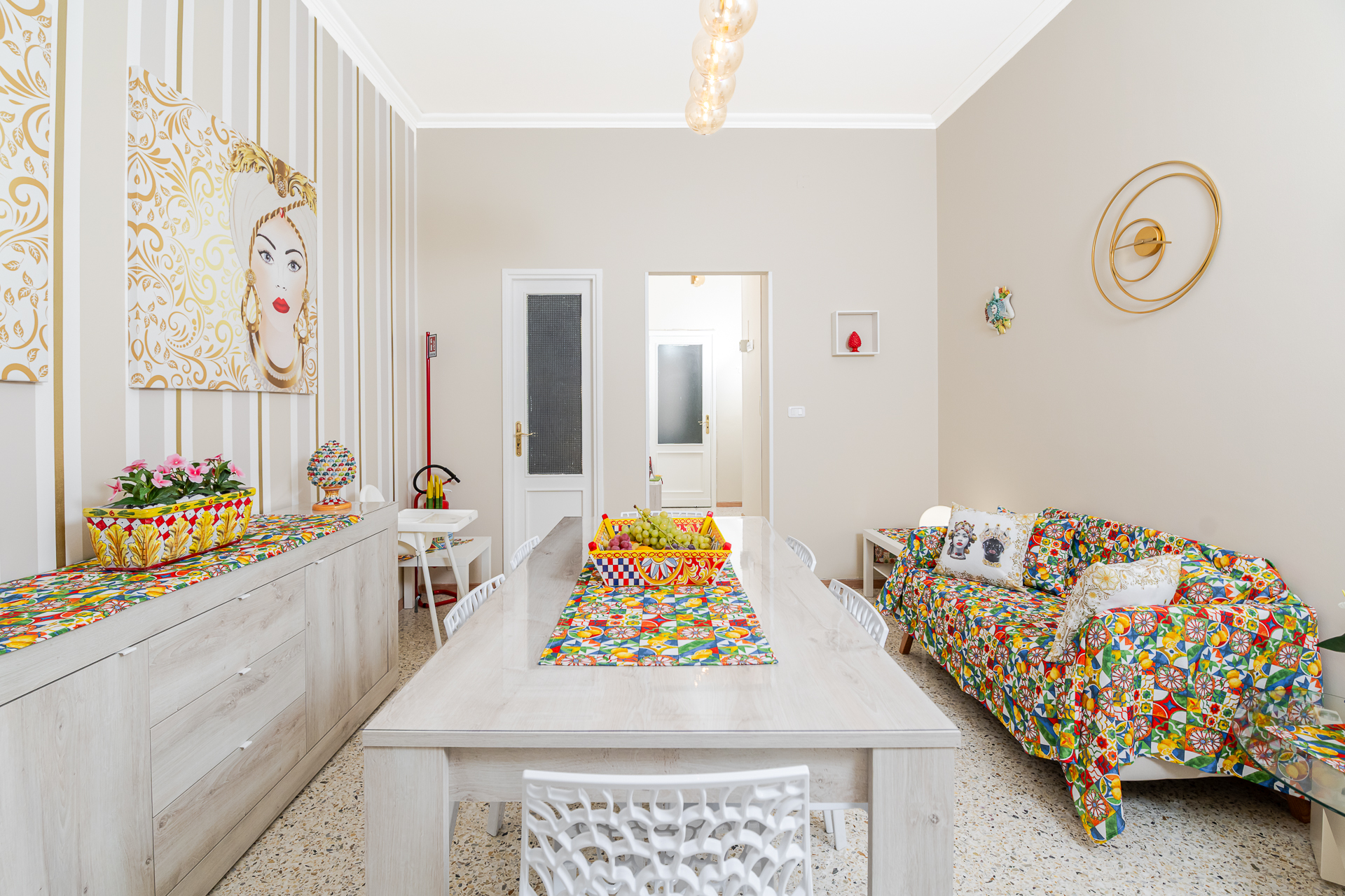 oven, mini-mixer, toaster, Nespresso coffee machine, kettle and whole cooking equipment. The Bathroom: with a spacious glass-shower decorated by Sicilian majolica’s tiles. The Laundry: with a proper washing machine. The apartment has two balconies, where seating during the warmest summer evenings and